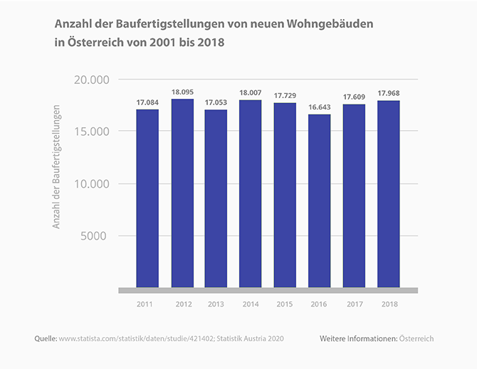 - Im Jahr 2018 wurden in Österreich 24.797 neue Gebäude und 69.214 neue Wohnungen gebaut.