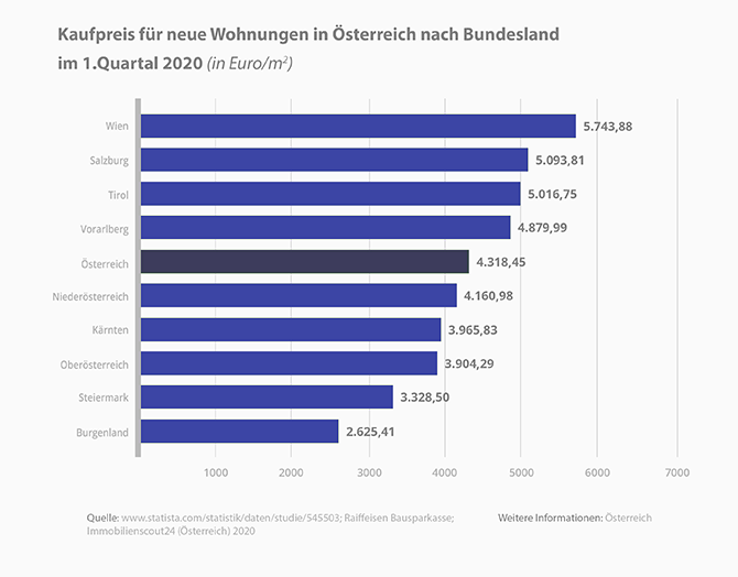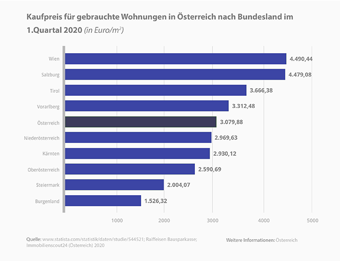 Der durchschnittliche Quadratmeterpreis für eine gebrauchte Wohnung über alle Regionen lag im ersten Quartal 2020 bei 3.080 Euro, wobei Wien, Vorarlberg und Tirol darüber lagen. Das Burgenland war – mit einem Preis von 1.526 Euro pro Quadratmeter – das günstigste Bundesland für den Kauf einer eigenen Wohnung.